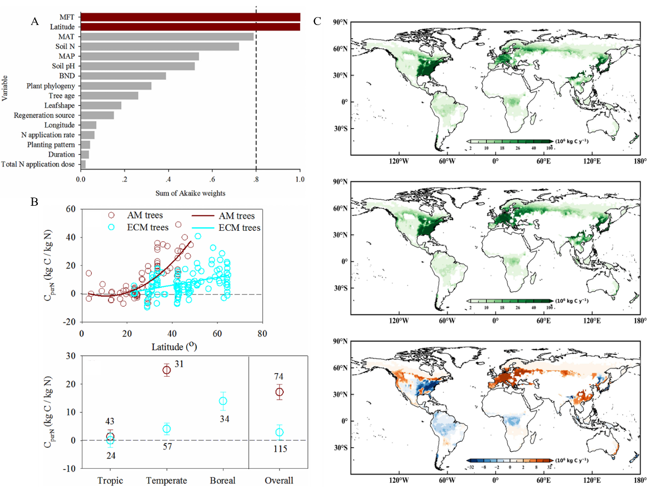 Figure. A. Model-averaged importance of the predictors of nitrogen addition impacts on tree biomass CperN. B. Changes of woody biomass CperN in tree species that associated with arbuscular mycorrhizal fungi (AM trees) and ectomycorrhizal fungi (ECM trees) with latitude and across biomes. C. Global distribution of nitrogen-induced tree carbon sequestration. (Image by CHEN et al)
