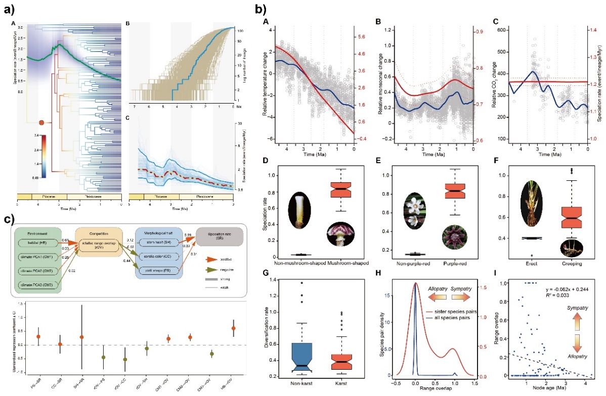 Recently, a collaborative study by researchers from the South China Botanical Garden and the Guangxi Institute of Botany investigated the evolutionary radiation of the plant genus Aspidistra. This genus is a large group within the family Asparagaceae, with over 200 described species. In addition to its high species diversity, Aspidistra exhibits notable geographical distribution patterns and remarkable floral morphological diversity, including widespread parapatric and sympatric distributions, as well as diverse stigma mimicry traits. To elucidate the evolutionary history and underlying mechanisms of its radiation, the research team performed restriction site-associated DNA sequencing (RAD-seq) on 123 Aspidistra species and reconstructed the most comprehensively sampled and highest-resolution phylogenetic tree for the genus to date. Based on this robust phylogenetic framework, they estimated the divergence times of the genus and analyzed its diversification dynamics using multiple approaches. The results show that Aspidistra is a young lineage that originated at the Miocene–Pliocene boundary (5.49 Ma; 95% HPD: 3.8–7.57 Ma). During the Mid-Piacenzian Warm Period (2.6–3.6 Ma), its speciation rate significantly accelerated, reaching 2.27 species per million years (Figure 1a). This rate exceeds all previously reported plant speciation rates in the Old World flora, indicating that Aspidistra represents one of the fastest known plant radiations in this region. Furthermore, by applying multiple statistical models, the team demonstrated that various biotic and abiotic factors—including paleotemperature, the East Asian monsoon, interspecific competition, and pollination mutualisms—could act both independently and synergistically to drive speciation and diversification in Aspidistra (Figure.1-b, c).