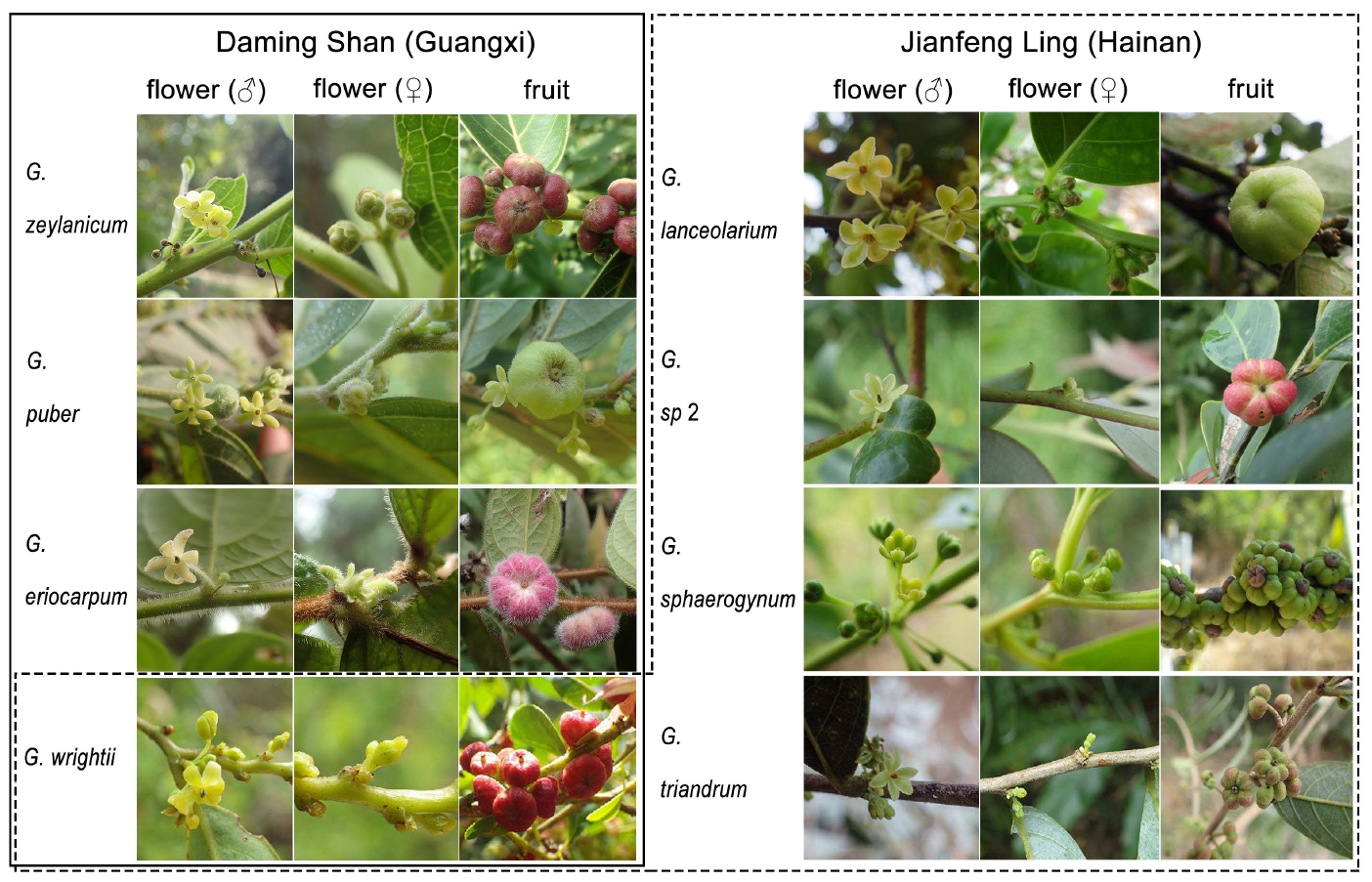 Figure 2. Diversity of Glochidion species found at two of the eight sites: Daming Shan (Guangxi) and Jianfengling (Hainan). One species, G. wrightii, is shared between the two sites. (Image by HAO et al.)