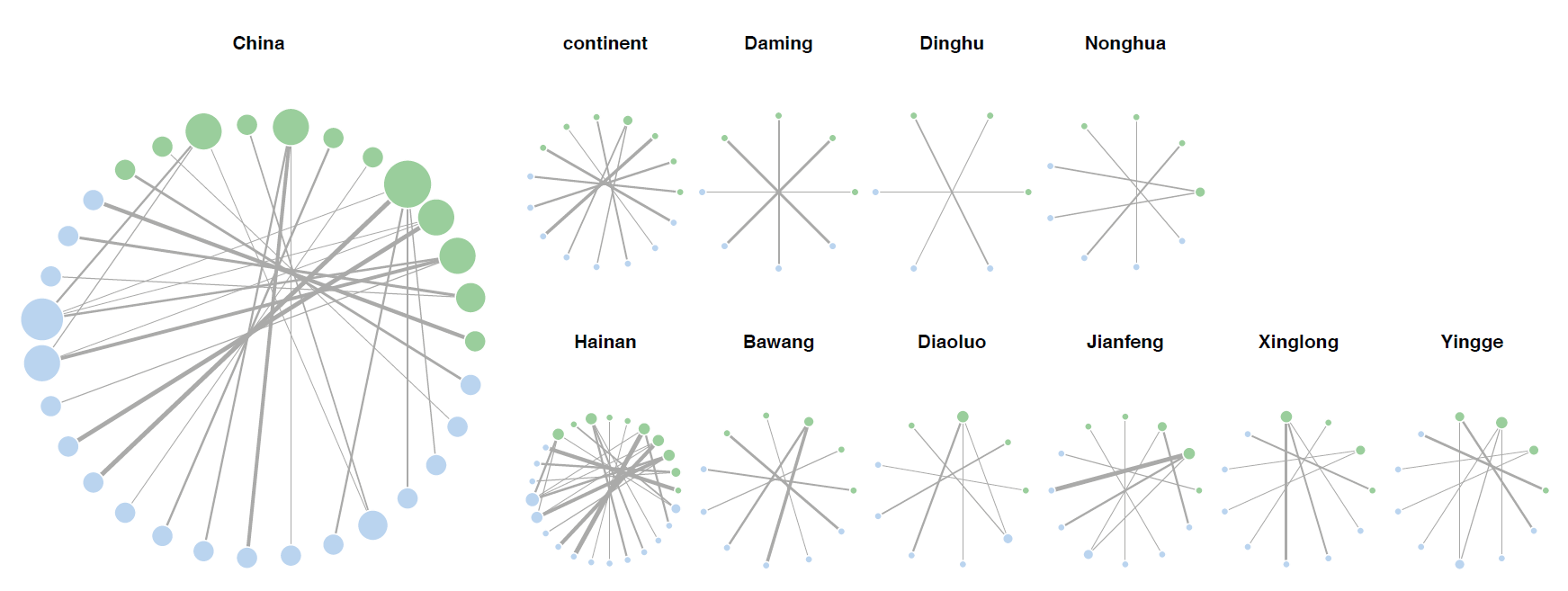 Figur 3. Local, subregional and regional networks recovered in this study. Green nodes indicate plant taxa (Glochidion) and blue nodes indicate moth taxa (Epicephala). Line thicknesses are proportional to the number of interaction events observed. (Image by HAO et al.)