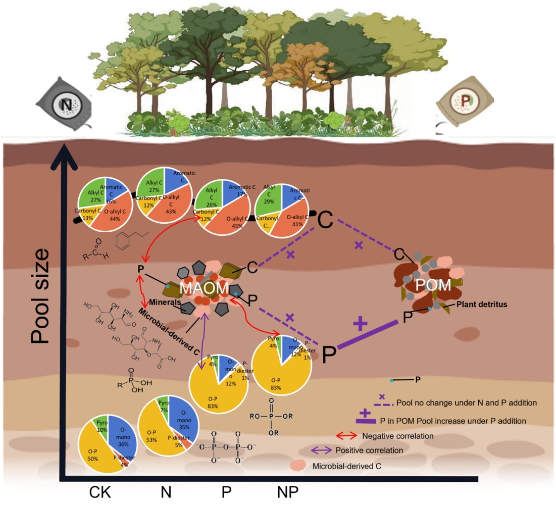 Based on a long-term nitrogen–phosphorus addition experiment established in 2009 at the Xiaoliang Tropical Coastal Ecosystem Research Station, the research team integrated solid-state ¹³C NMR, liquid-state ³¹P NMR spectroscopy, and soil organic carbon fractionation techniques. Together, these approaches allowed a systematic assessment of carbon and phosphorus concentrations and their chemical speciation within two functional soil carbon pools: particulate organic matter (POM) and mineral-associated organic matter (MAOM). POM originates mainly from plant residues and turns over relatively quickly, whereas MAOM is derived largely from microbial transformation products stabilized through mineral associations. These pools jointly determine the persistence of soil organic carbon.
