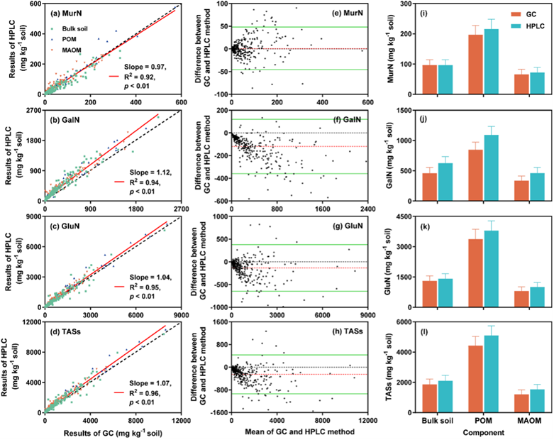 Fig. 2. Consistency between GC and HPLC methods in measuring amino sugars across different soil fractions.(Image by MOU et al.)