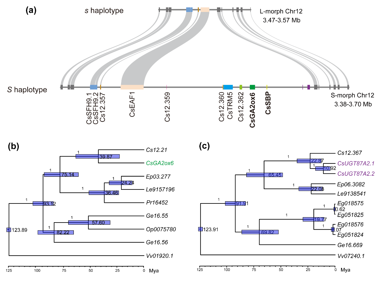 Recently, researchers from SCBG constructed chromosome-scale genome assemblies for both long-styled (L) and short-styled (S) morphs of C. subcordata. By integrating whole-genome resequencing, transcriptomic analyses, and transgenic functional validation, they conducted a comprehensive investigation into the structure, function, and evolutionary origin of the supergene controlling distyly in this species. The results revealed that: (1) The S-locus controlling heterostyly contains an approximately 180-kb hemizygous region comprising eight candidate genes, which is present exclusively in S-morph individuals and completely absent from L-morphs; (2) The genomic locations of paralogous genes and estimates of duplication ages suggest that the S-locus may have arisen through stepwise duplications; (3) Within the supergene, CsSBP (Squamosa promoter-binding protein) is specifically expressed in the filament–corolla tube region of S-morph flowers and plays a key role in regulating filament elongation; and (4) CsGA2ox6, a gene involved in gibberellin deactivation, is exclusively expressed in S-morph pistils. Transgenic experiments further demonstrated that overexpression of CsGA2ox6 in tobacco results in pronounced shortening of the styles and induces pollen tube growth arrest resembling self-incompatibility. These results suggest that CsGA2ox6 may simultaneously regulate style length and self-incompatibility.