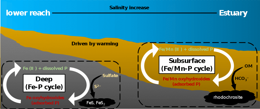 Sediment P release (internal P loading) is a crucial process regulating the nutrient structure of water bodies in estuarine regions. The endogenous release of P is mainly driven by the redox behavior of Fe and Mn: under anoxic conditions, microorganisms use organic matter as electron donors to reduce Fe/Mn oxides and release the adsorbed P. In this process, temperature is a key influencing factor, as it directly controls the rate of microbial mineralization of organic matter. However, in estuarine regions with complex hydrodynamic and depositing environments, how seasonal temperature regulates the coupled cycling of Fe/Mn and P, especially in newly deposited surface sediments with unstable redox interfaces, remains unclear.
