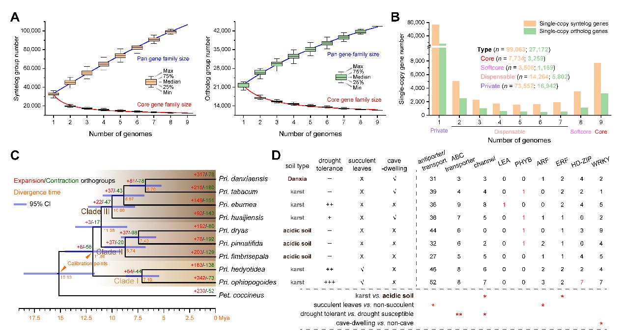 Recently, a research team from the South China Botanical Garden (SCBG) of the Chinese Academy of Sciences (CAS) assembled seven genomes and constructed a Primulina pan-genome spanning nine species from karst, Danxia and acidic soils. Comparative analyses reveal that karst-adapted species have smaller genomes than non-karst species, strongly supporting the nitrogen limitation hypothesis. Two lineage-specific whole genome duplications (WGDs) exhibit biased duplicate loss in large gene families but preferential retention of transcription factors, indicating combined adaptive and nonadaptive forces.
