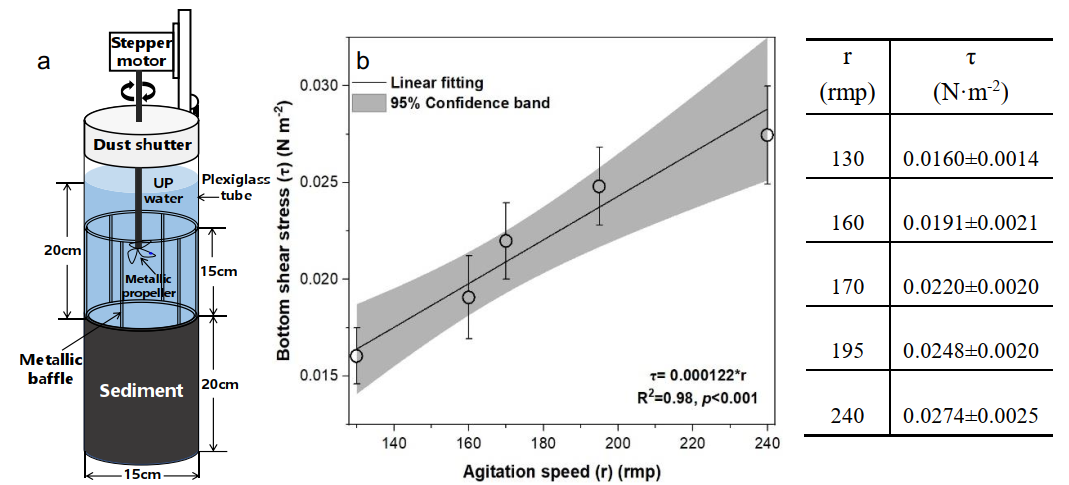 The resuspension simulation experiment in this study was conducted using a modified EROMES erosion system, consisting of an erosion tube with an inner diameter of 15 cm, a turbulence baffle, and a stirrer. A rotating propeller was installed 7.5 cm above the sediment-water interface, and the built-in turbulence baffle was used to reduce swirling flow, ensuring that the sediment was subjected to uniform shear stress for resuspension. The threshold rotation speed for quartz sand resuspension was determined based on the surge point of turbidity, and the critical shear stress was calculated using empirical formulas to calibrate the response relationship between bottom shear stress and rotation speed. This study employed the EROMES system to quantitatively analyze the critical shear stress for the resuspension of sedimentary MPs, marking the first application of this device in MPs dynamics research.