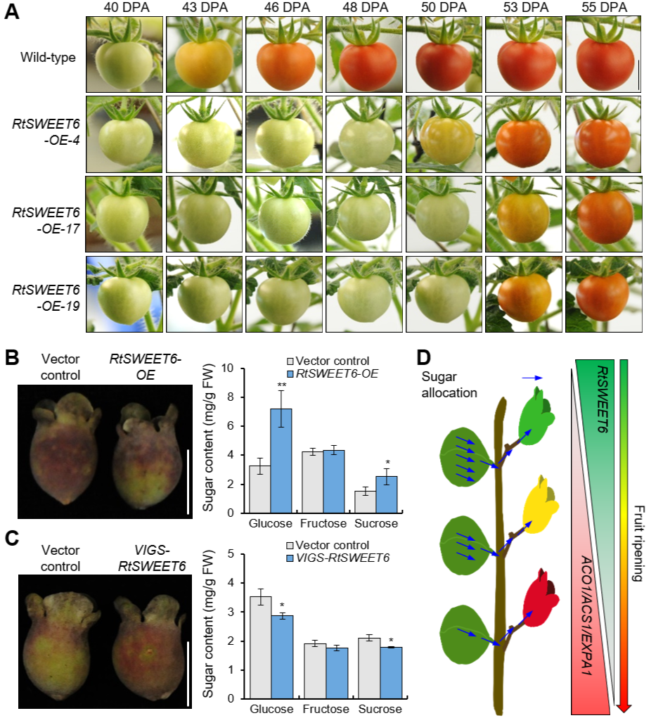 Figure. RtSWEET6 mediates the sugar accumulation and fruit ripening.(Image by DENG et al.)